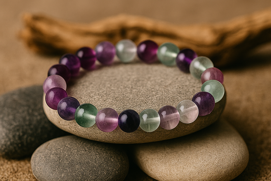 La fluorine, avec ses nuances allant du vert tendre au violet profond, captive par sa transparence et ses jeux de lumière. En bracelet, elle attire l’œil par sa beauté naturelle et son effet calmant. C’est une pierre qui apporte du calme à l’esprit, clarifie les idées, et aide à retrouver une vision d’ensemble dans les moments de confusion.