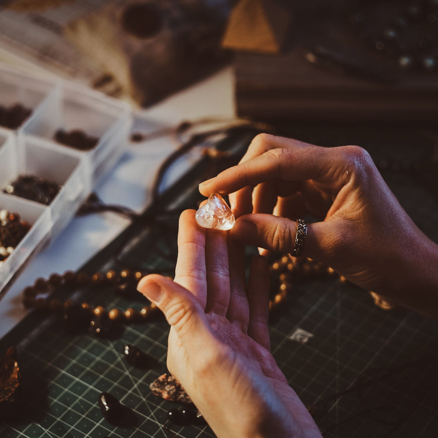 1. Sélection des pierres : Nous choisissons des pierres brutes d'exception, provenant de sources responsables et éthiques. Opales, agates, jaspes et autres merveilles naturelles sont sélectionnés pour leur qualité et leur beauté unique.