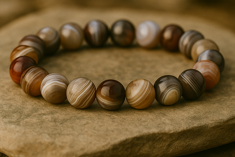 L’agate zonée, avec ses superpositions de bandes aux tons bruns, beiges, gris ou ocres, est une pierre fascinante, presque hypnotique. En bracelet, elle évoque la patience du temps et les couches de l’histoire terrestre. C’est un bijou d’ancrage, à la fois sobre et chargé de symbolique, parfait pour celles et ceux qui recherchent un retour à l’essentiel.