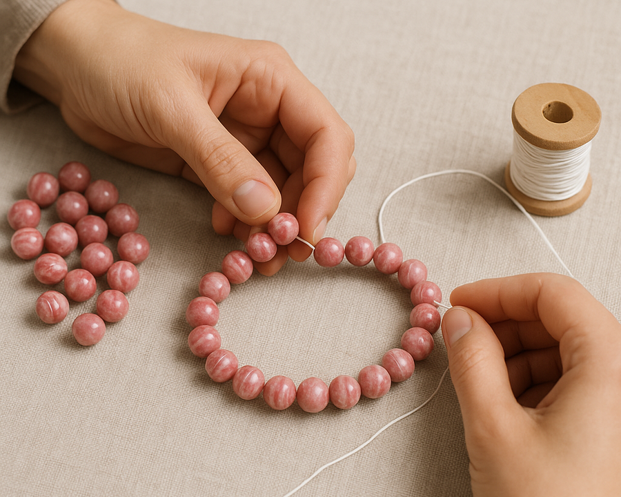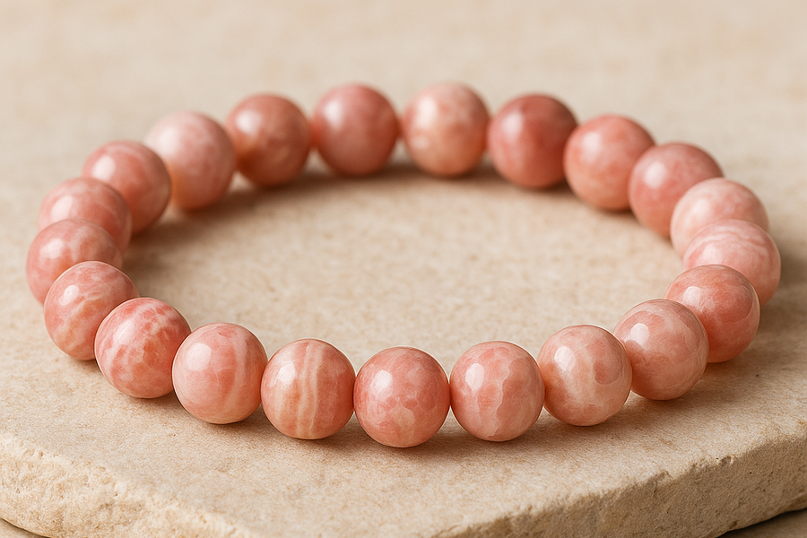 Avec ses teintes allant du rose poudré au rose framboise, la rhodochrosite attire l’œil par son élégance naturelle et son aspect tendre. Montée en bracelet, elle incarne la douceur du cœur, tout en révélant une profonde capacité à soigner les blessures émotionnelles et à restaurer la confiance en soi.