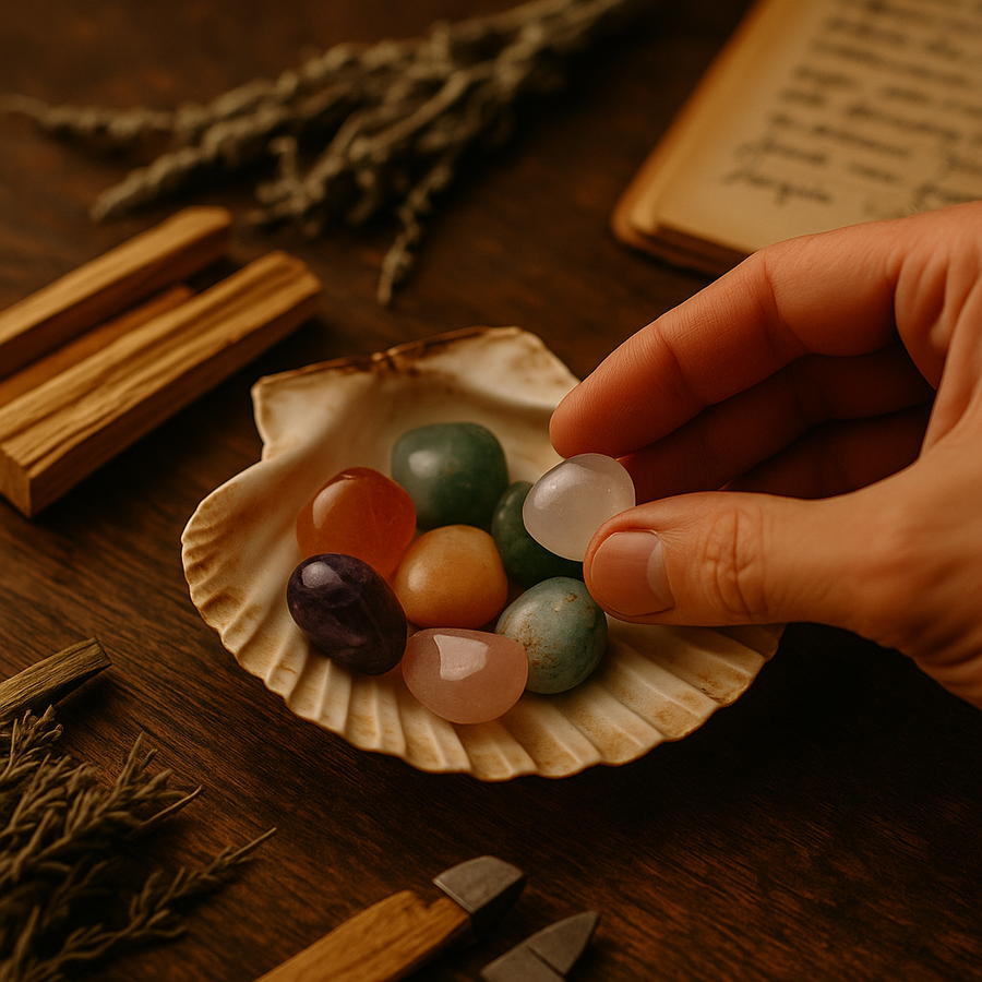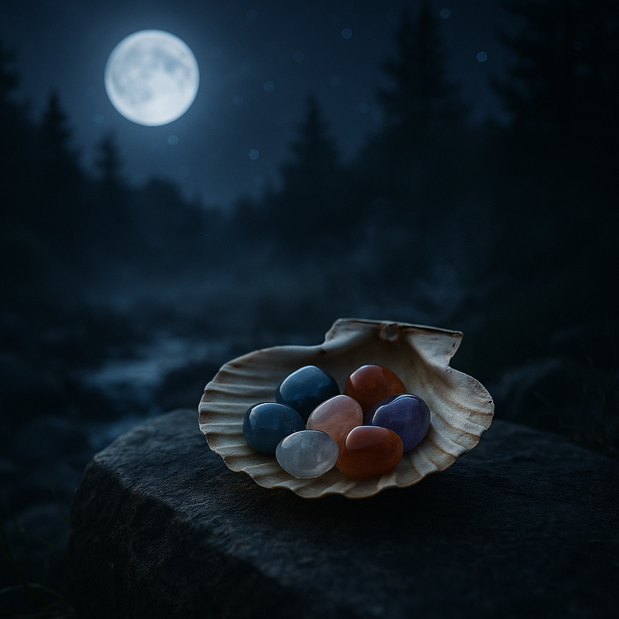 Cette méthode est particulièrement adaptée aux pierres sensibles. La coquille agit comme relais doux, permettant à la pierre de reprendre force sans saturation.