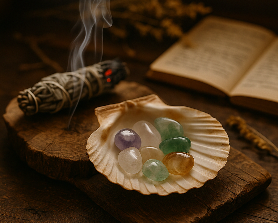 On place une pierre dans une coquille pour l’aider à libérer les énergies qu’elle a accumulées. Ce processus ne repose pas sur l’eau, le sel ou la fumée, mais uniquement sur la résonance naturelle de la coquille.