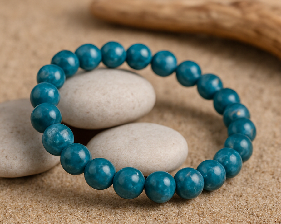 Avec ses reflets bleus intenses, parfois turquoise, parfois plus profonds, l’apatite est une pierre vibrante qui capte immédiatement l’œil. Montée en bracelet, elle devient un bijou stimulant, plein d’énergie et de mouvement. Que ce soit pour accompagner une démarche d’affirmation personnelle ou simplement pour son éclat unique, le bracelet en apatite allie beauté brute et énergie communicative.