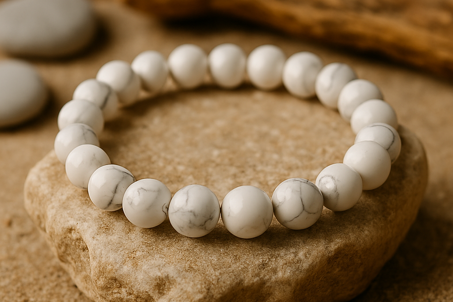 Avec son blanc mat veiné de gris, la howlite séduit par son aspect doux et minéral. En bracelet, elle évoque immédiatement le calme, la simplicité et la pureté. C’est une pierre idéale pour apaiser les tensions mentales et retrouver une forme de sérénité intérieure. Elle séduit autant par son esthétique que par ses bienfaits reconnus en lithothérapie.