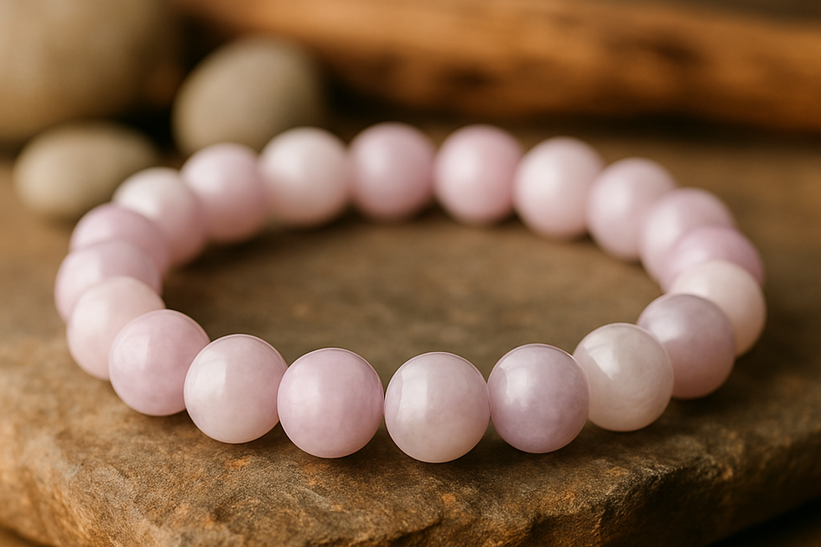 Avec ses reflets tendres allant du rose pâle au lilas doux, la kunzite dégage une aura apaisante. En bracelet, elle invite à l’ouverture du cœur et à la bienveillance envers soi-même et les autres. C’est un bijou délicat, souvent choisi pour sa douceur vibratoire et son pouvoir réconfortant.